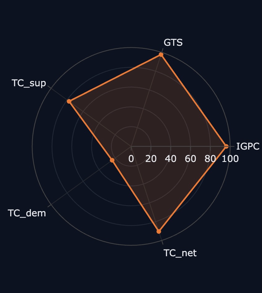You can see this in the plot below. This plots a radar plot capturing different dimensions of ethylene in the current trading system. It presents a measure of supply and demand concentration TC_dem, TC_sup (a Herfindahl index) globally. This is expressed in percentiles relative to all global trade across all other goods.
