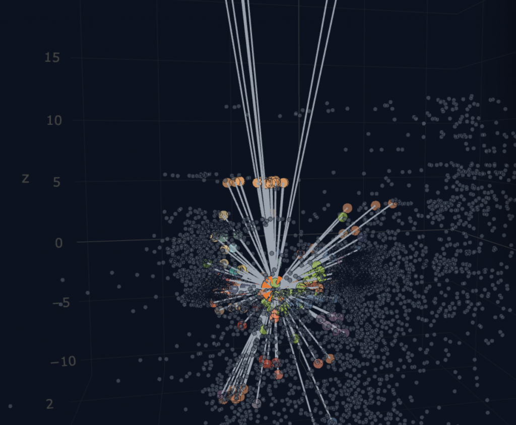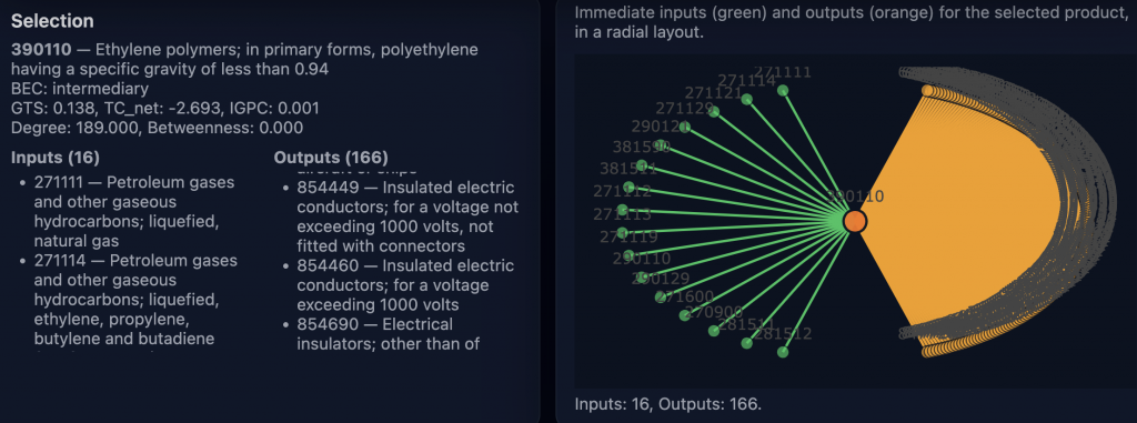 Ethylene is a basic polymer that, as a basic material, has many onward uses. This means its very central in a production network with many outdegree links or onward uses and few inputs. This is quite visible when we plot the ethylene in- and outdegree links in a HS6 production network view in a 3-dimensional vector space.