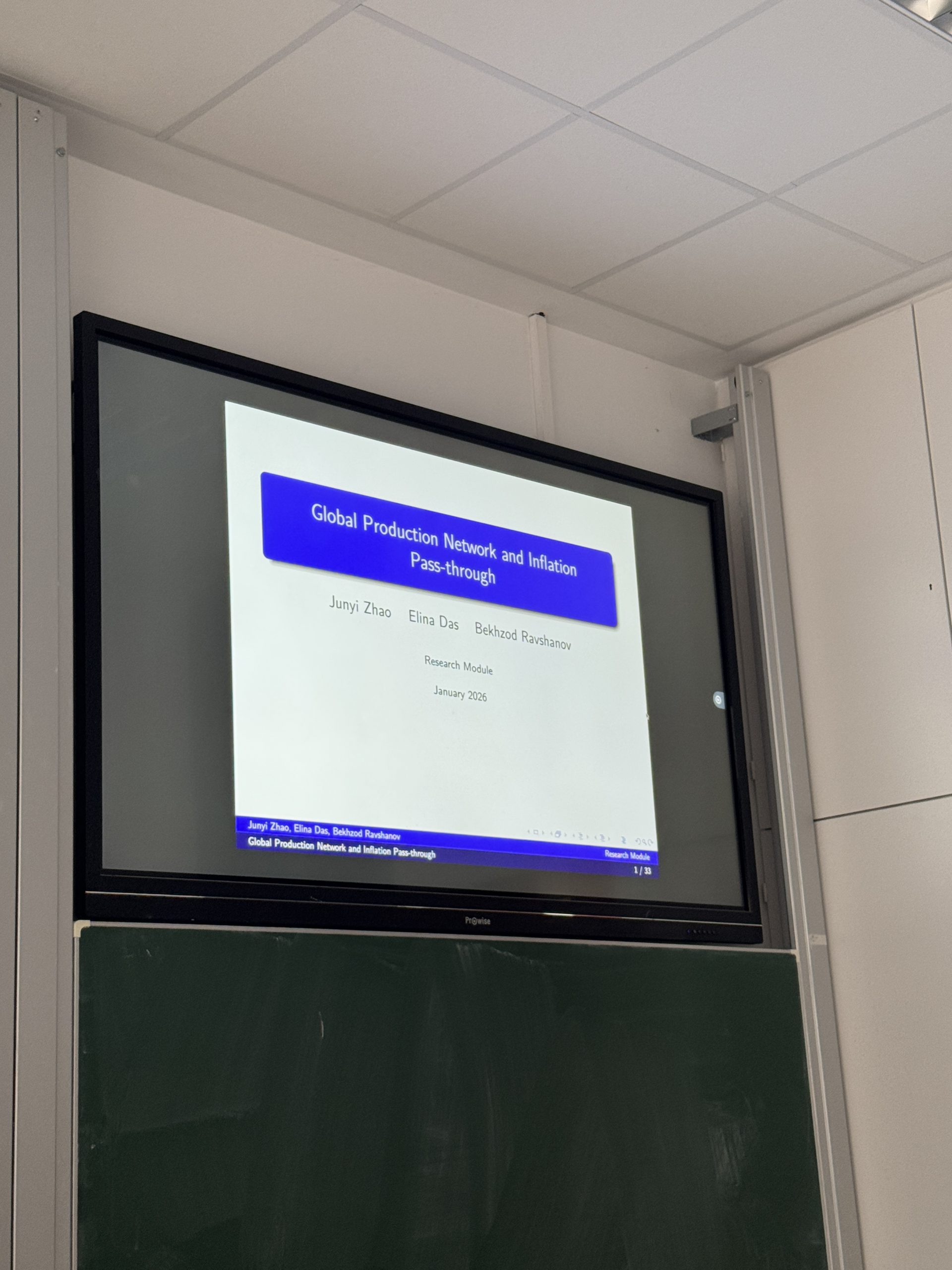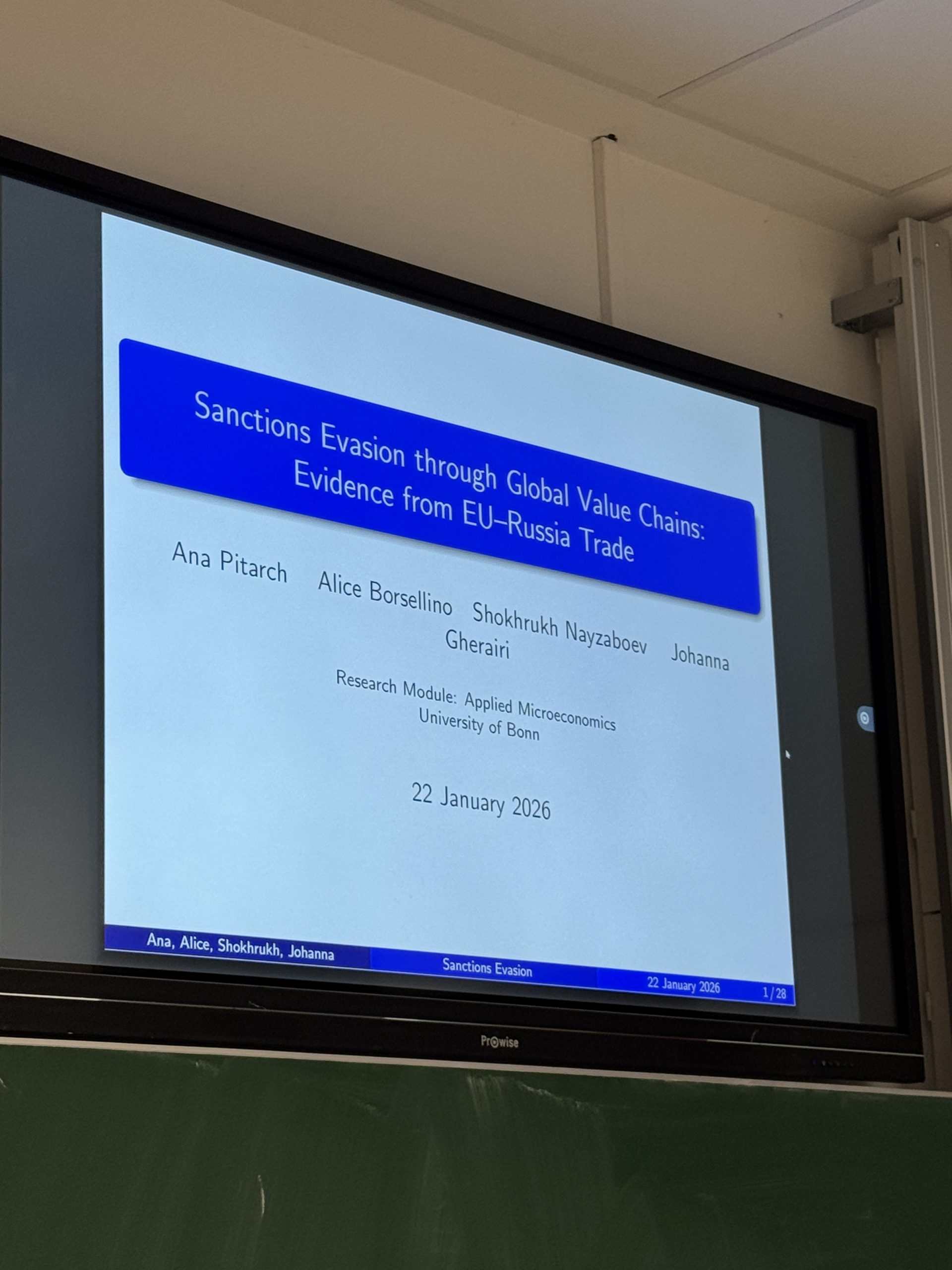 In the Research Module of AI in Applied Economics module, student teams developed applied research projects that combine AI-enabled measurement with policy-relevant economic analysis. Across the four projects, the central themes were sanctions and trade rerouting, task-level AI exposure in labor markets, EV transition risk, and inflation transmission through production networks.