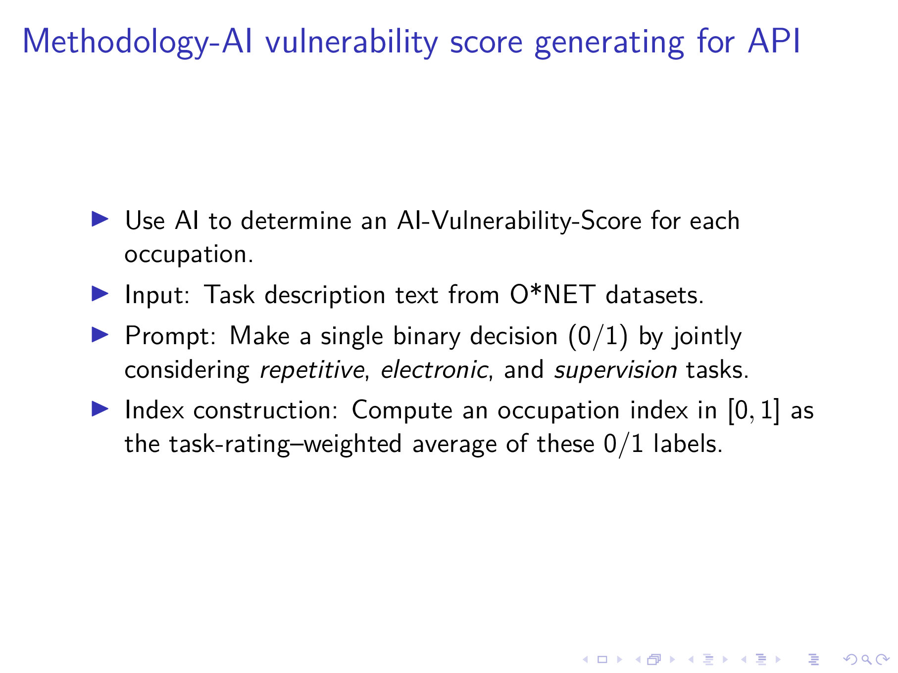 A key strength was the treatment of measurement itself as an empirical contribution rather than as an imported index. The workflow integrated O*NET task content, constructed multiple exposure variants, and then tested how those measures align with unemployment risk and distributional heterogeneity across labor-market segments.