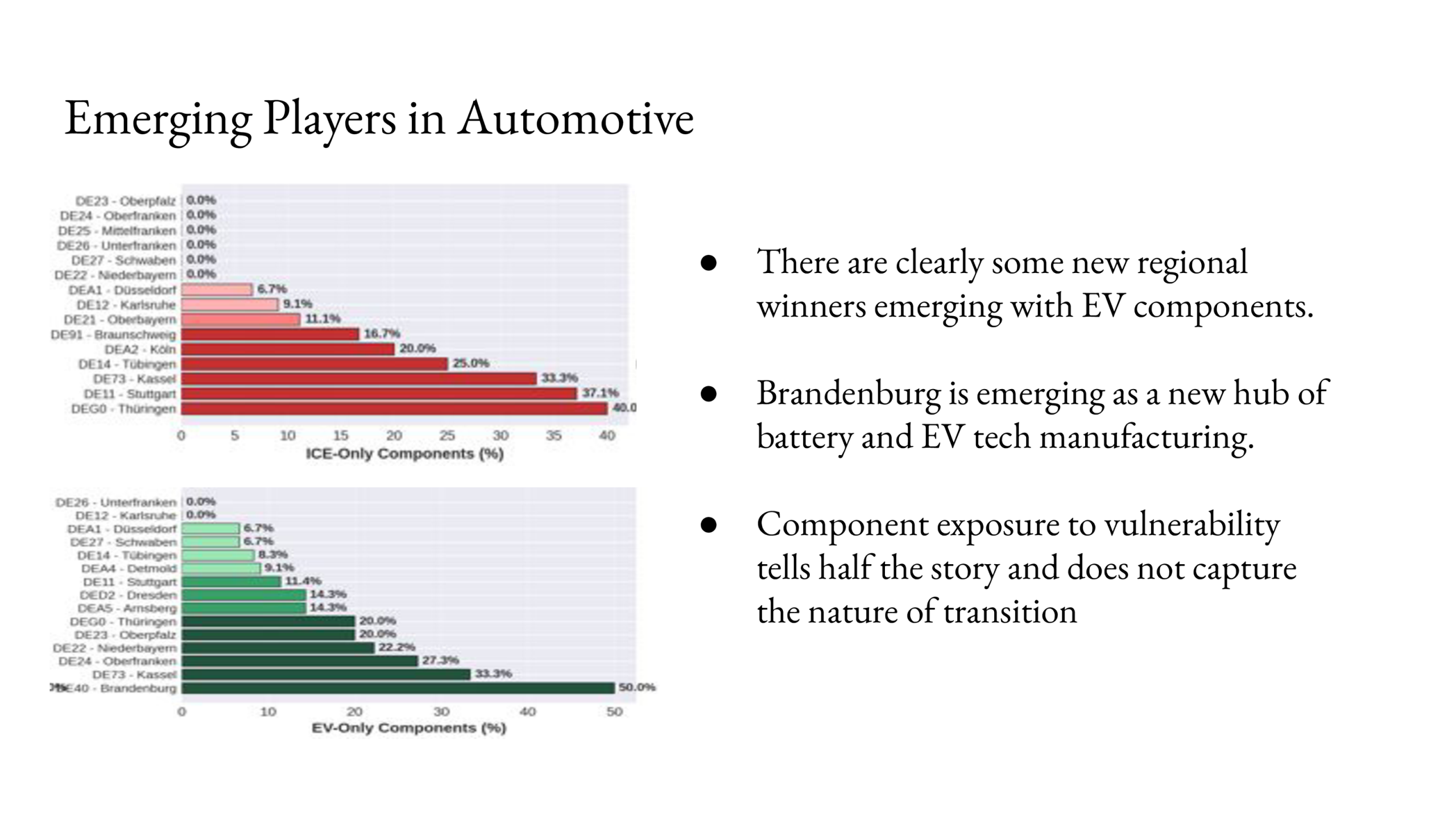 Group 3 built a structured framework to classify automotive components as ICE-only, EV-only, or shared, and then used those classifications to construct a regional vulnerability index for German NUTS-2 regions. The project’s core analytical choice was to separate exposure from vulnerability, rather than treating these as equivalent.