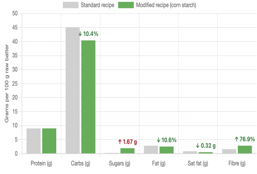 Normalising the standard recipe to an index of 100 allows us to see this cleanly: carbon intensity falls much faster than calories as egg share is reduced, because emissions are convex in animal inputs while caloric density is not. The modified recipe, using corn starch and chickpea flour as structural complements, lands around three quarters of the original carbon footprint while retaining more than ninety percent of the energy density per 100 g of batter.