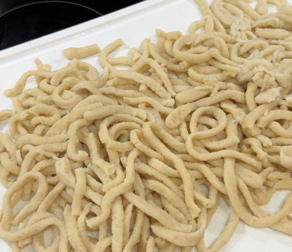So I went on to create a new-ish version of Spaetzle that significantly reduces the egg content, without sacrificing protein, flavour, texture, but with the benefit of the fibre that we get from the wholegrain flour. Right now, there are Gluten-free versions of Spaetzle that use chickpea flour, but not for the explicit purpose of decarbonization or making Spaetzle more healthy.