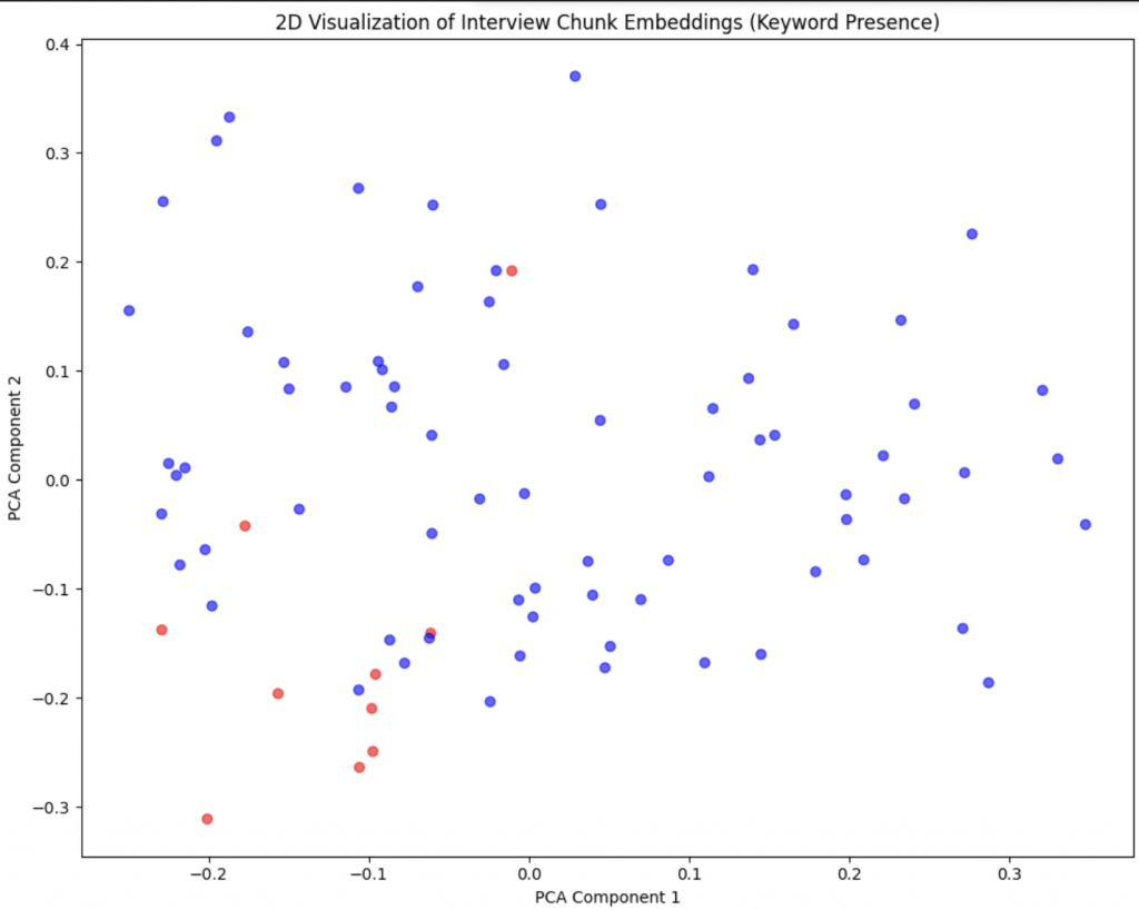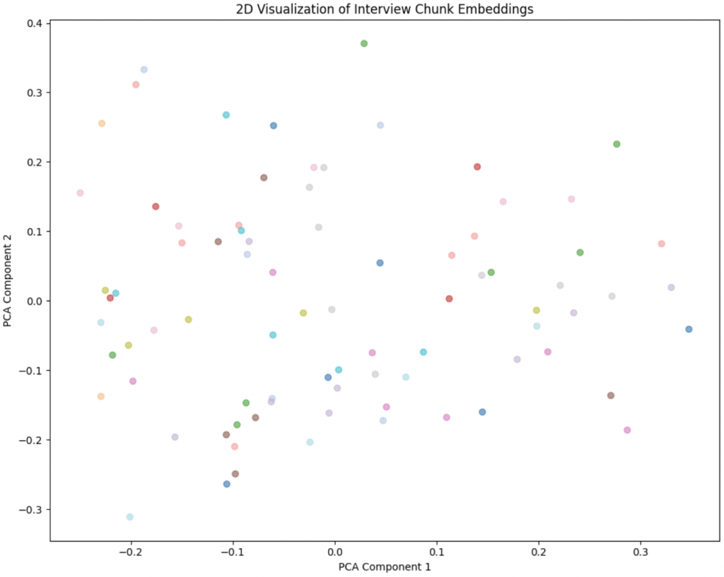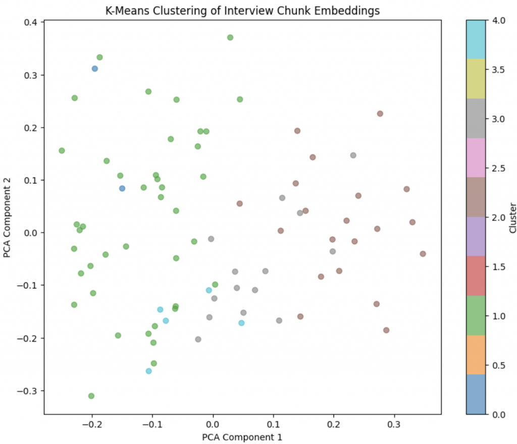 Below is an example output visualized in two dimensions on which I have then performed clustering. From left to right, we see that in two dimensions across the different data subjects/speakers, the points are quite scattered. This is because the present chunking strategy does not distinguish between the different dimensions of the interview as is illustrated in the second panel. There I colored points based on an ad-hoc classification of the chunk into different topic. We see that this is picking up some signal as there is a markable clustering of red points in the bottom right (these are chunks that talk about the same dimension/topic). Lastly I also looked at some K-means clustering but that is not super useful.
