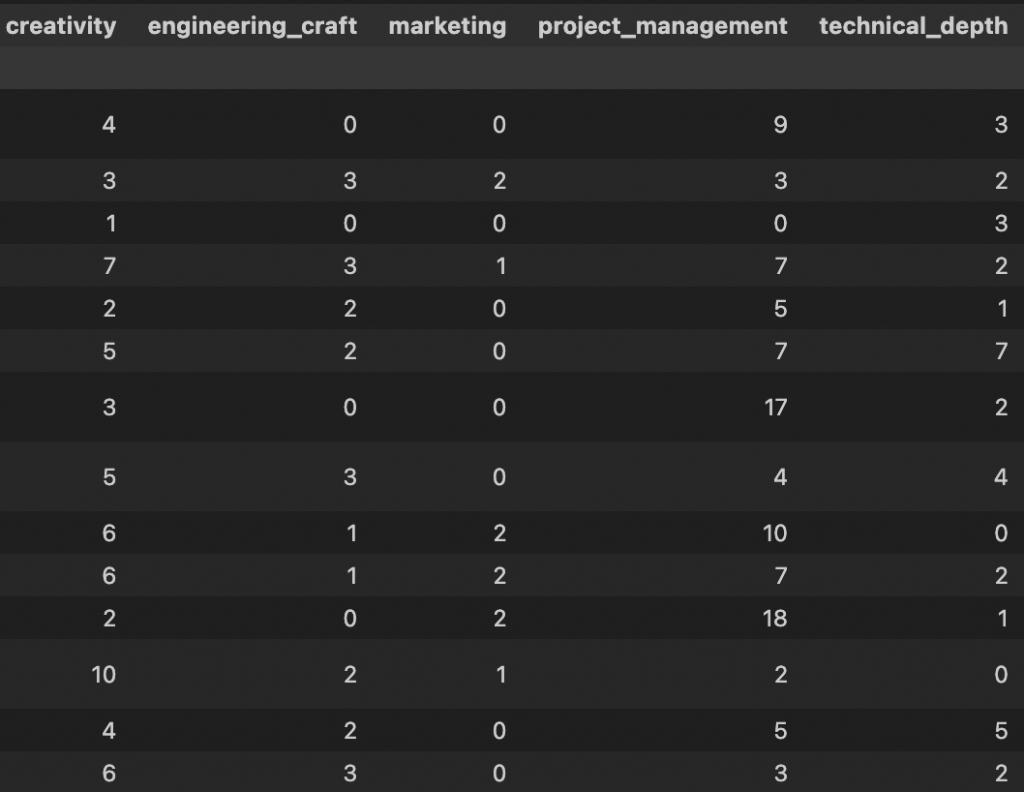 In order to do that I interviewed each student. I developed a quick interview protocol that aims to elicit three to five dimensions that I find relevant: technical depth/engineering depth, creativity, project management and marketing.