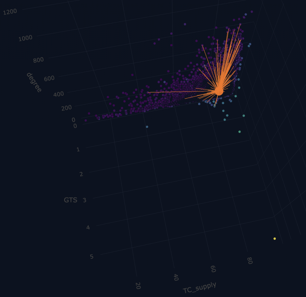 If we span a three dimensional graph in these dimensions. The node highlighted here is petroleum oils/minerals. It highlights what we may suspect or expect: crude oil has a high degree of supply concentration, it makes up a big chunk of global trade, and is itself a modest amount of out-degrees but there are tons of indirect and onward uses. In some ways we can think about hydrocarbons spanning the production network or the modern economy more broadly.