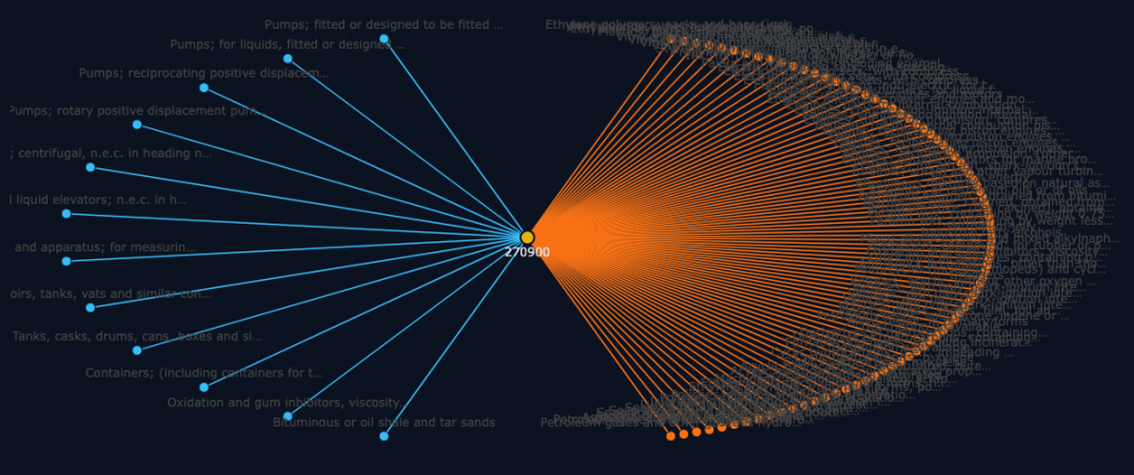 Here you see in essence the input- and the output nodes separated visually. It highlights how crude is an input to many goods that are internationally traded that make part of our modern economies.