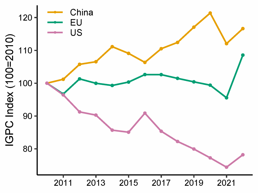 In the paper, we present this graph. This to me highlights the geopolitical contest and its build up in a single graph. I will explain what is going on under the hood. But for China, there is a clear upward trend in IGPC centrality over time, reflecting rising systemic importance in critical intermediate inputs and vertically integrated clusters. The measure captures China’s expansion across upstream components (e.g., machinery, electronics, EV supply chains, critical minerals). It highlights how China has become the manufacturing hub of the world, that has increasingly absorbed and focused on critical materials, minerals and energy.