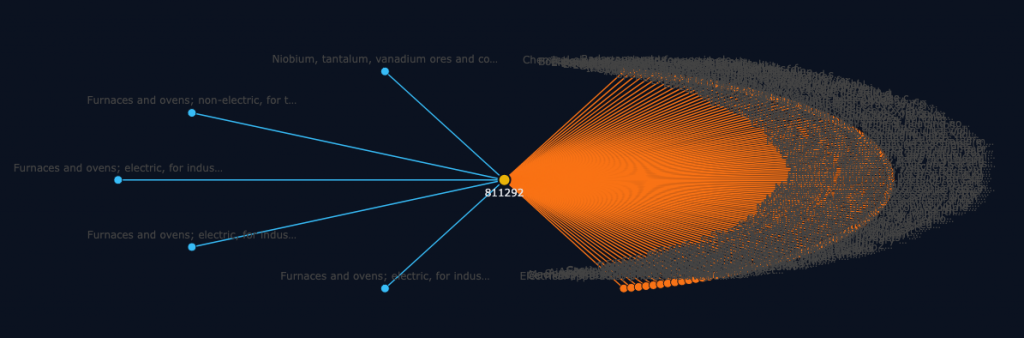 We can do a similar visualization for the case of rare earths, for example, considering Gallium, Germanium etc. This is the case of the famous rare earths that China has, over decades, built leverage and control over through the deployment of industrial policy; what some call a creative approach to WTO membership and the potential deployment of strategic reserves to undermine private sector led rare earth refinement sector development. You see that in this canvas or visual, Gallium is quite central, but it has a tiny share of the amount of global trade. But, it is essentially Leontieff in the production process — incredibly hard to substitute (we are working on measuring this better), and it is very much important in many production processes as an input that is hard to replace