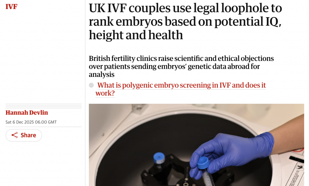 On the possibility of genetic selection This article on the possibility and lived reality that some are engaging in polygenic embryo selection in the United Kingdom shows that the practice is far from a medical safeguard against single‑gene disorders. Instead, it is a deliberate attempt to rank embryos on predicted IQ, height, and health. The method exploits a legal and data‑protection loophole to obtain raw genetic data, send it abroad for polygenic scoring, and then use the results to choose which embryos to implant. The practice is not permitted in UK clinics, yet it persists because it satisfies a deep‑seated fear among parents: “I hope my child is not stupid.”